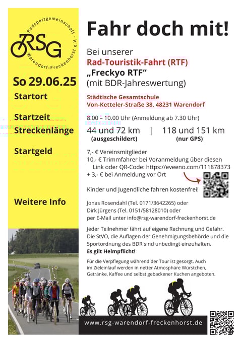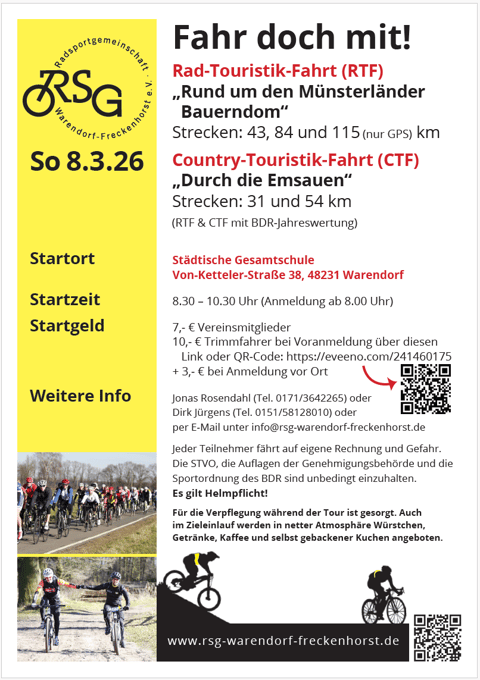 Die Teilnahme ist kostenlos, eine Anmeldung ist erforderlich unter: info@rsg-warendorf-freckenhorst.de. Mitzubringen ist ein Helm und ein eigenes Fahrrad.